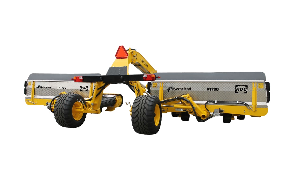The Kverneland ROC RT 730 machine is designed with two pick-up units that can be hydraulically shifted to allow the operator to use it for side or centre delivery. The side delivery has a minimum working width of 7m, while the centre swath can expand to a maximum of 7.30m.The remarkable features include excellent suspension for lifting and transporting crops without soil contamination. Its six-bar pick-up and roller work well for various silage cuts, and the reinforced belt has saw-blade-shaped crossbars for all crop conditions.The Kverneland ROC RT 730 can be folded to 2.5m width for easy road transport and has road suspension for comfortable and fast transportation.